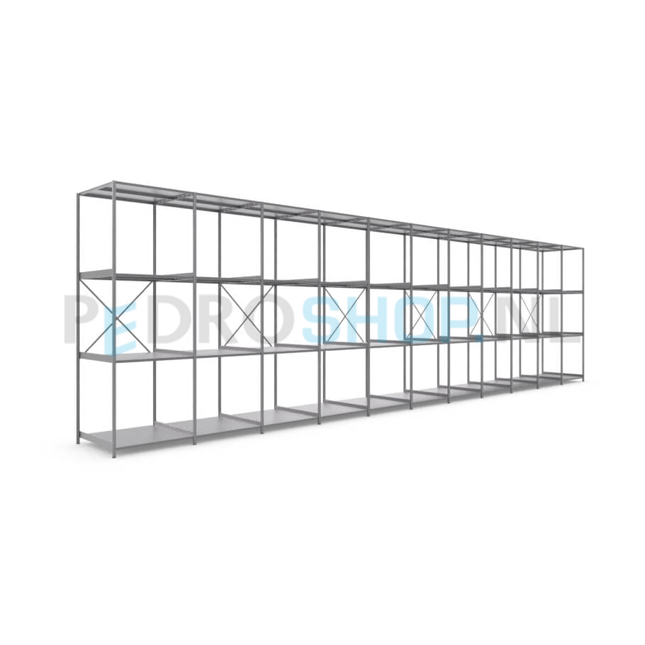 Metalen stellingkast: 300cm (h) x 100cm (d) x 1110.2cm (l)