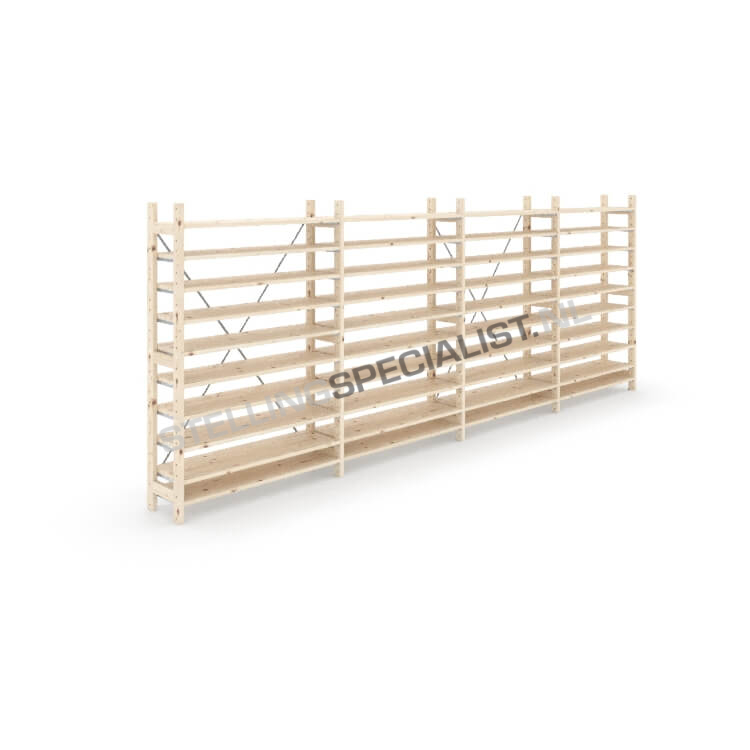 Eigen label houten stellingkast, dus goedkoop, flexibel en snel leverbaar! De onderdelen van de houten stellingen van ons eigen label zijn gemaakt van eersteklas Oost-Europees vurenhout en garanderen daarom jarenlang gebruiksgemak. Met de houten legbordstellingen en houten rekken kunt u uw magazijn eindeloos aanpassen, herinrichten en uitbreiden. U kiest voor betaalbare houten rekken, flexibiliteit met een goede kwaliteit! De houten stellingkast kunt u via onze handige configurator in een aantal stappen online samenstellen. Online uw houten stellingkast bestellen is nog nooit zo makkelijk geweest. Heeft u een groot archief in te richten met houten stellingen? Wij maken graag een passende offerte. Houten stelling kopen? Dan bent u bij ons aan het juiste adres.